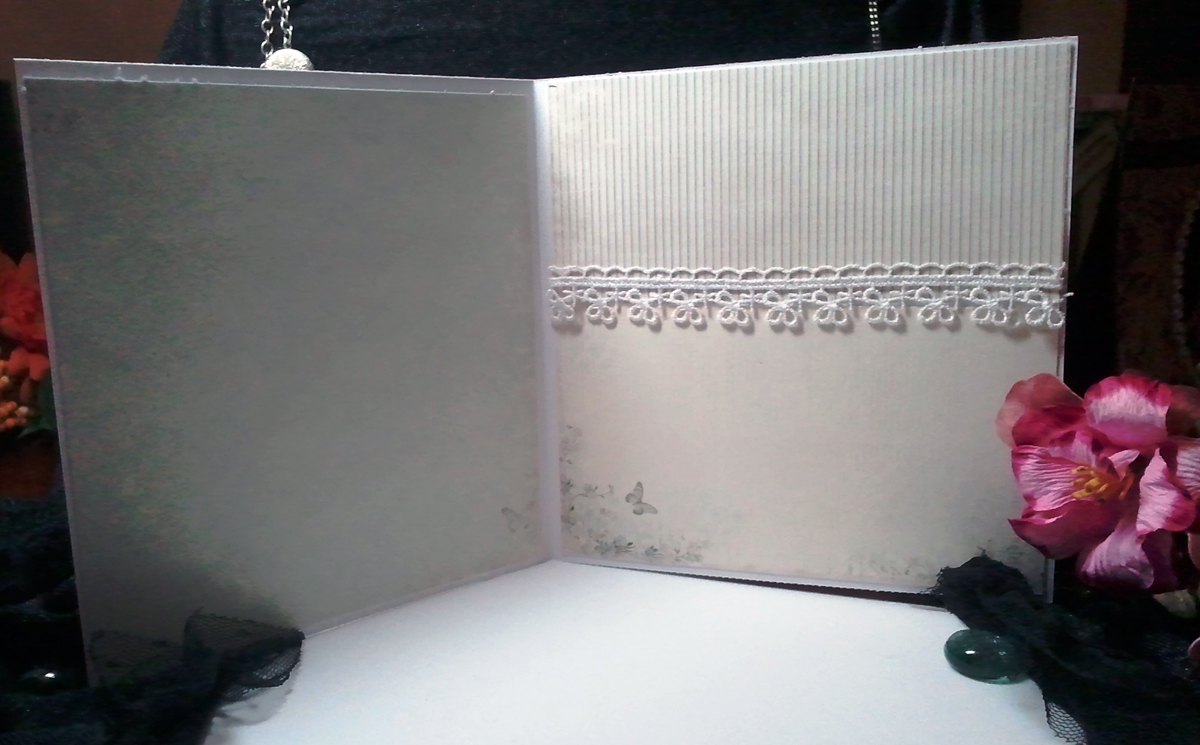 When I got to the inside I was so frustrated with the folds that I wasn't really designing, I was just trying to get finished so I came up with this, which after looking at it I thought, hey not to bad...I think I like it. The border lace I used was part of a border sticker I had gotten ages ago and the sticky didn't stick anymore so instead of thrashing the whole thing I managed to salvage the ribbon lace that was connected to it. Nowadays, it seems I can't throw anything away. I hope this isn't a sign of hoarding....cause I will be in trouble. Well my precious "peeps" (where did that word come from anyway) I need to go take more pictures. I'll be back as soon as I can.