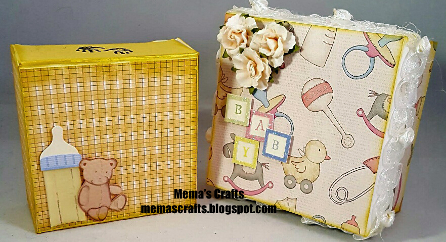 The cards are 3 x 3 with envelopes and a box to store them in. I created two different box styles just to see how many would fit in each. I colored them with Copics and on the inside I simply stamped a hand-print on the left and a foot-print on the right.