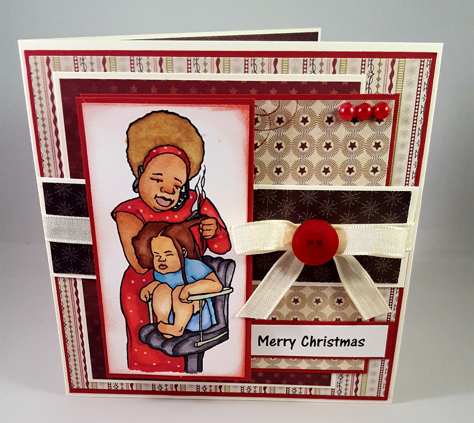 Hopefully, this card will put a smile on my beautician's face.  The image is one by Robert Jackson and she was colored with Copics. The DP is an old MME called Santa Claus. The inside has two messages.  One side says "Beauty comes from the inside...from the inside of a Beauty Salon" and the second message in keeping with the Christmas spirit says, "Hope your holidays are "STYLED" with fun...Merry Christmas".
